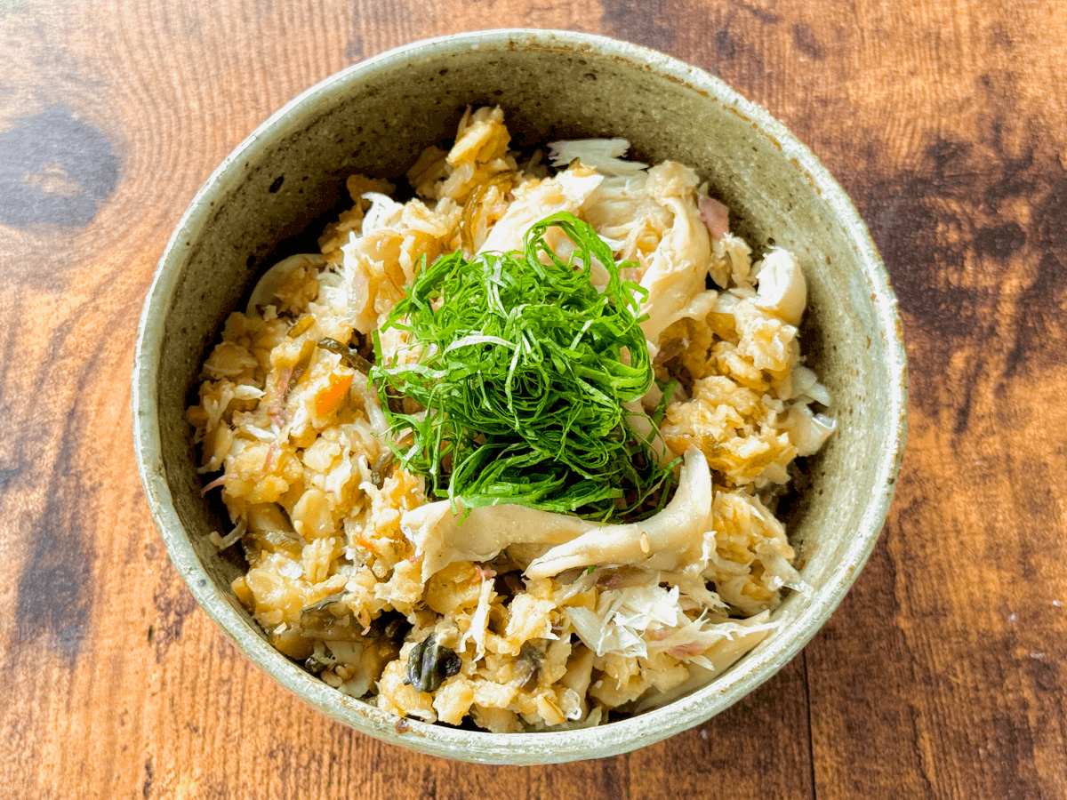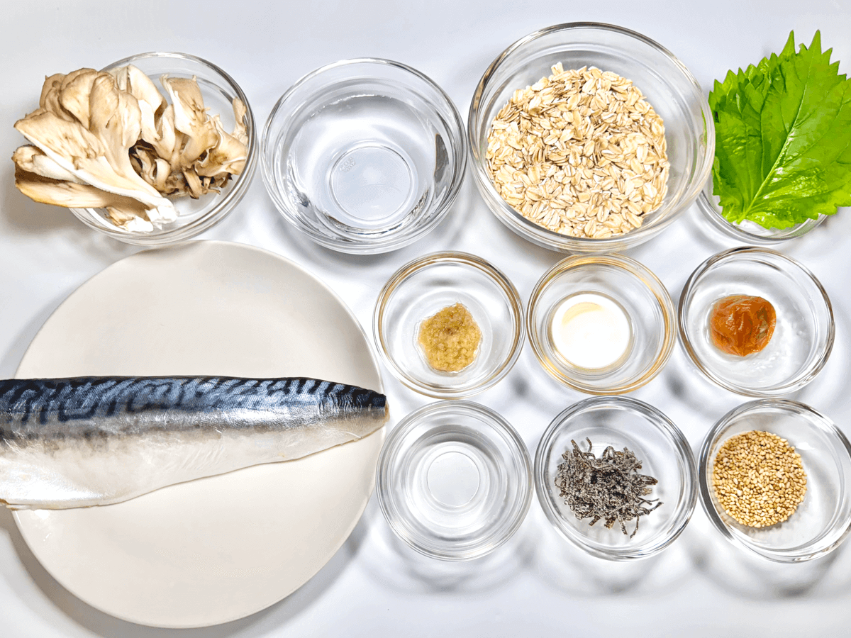 塩さばは酸味ととても相性が良いので、「梅干し」を入れることで脂の臭みを取ると同時に旨味を与え、塩昆布やまいたけなど旨味で調和させることで、オートミールを違和感なく炊き込みご飯風に仕立てました。