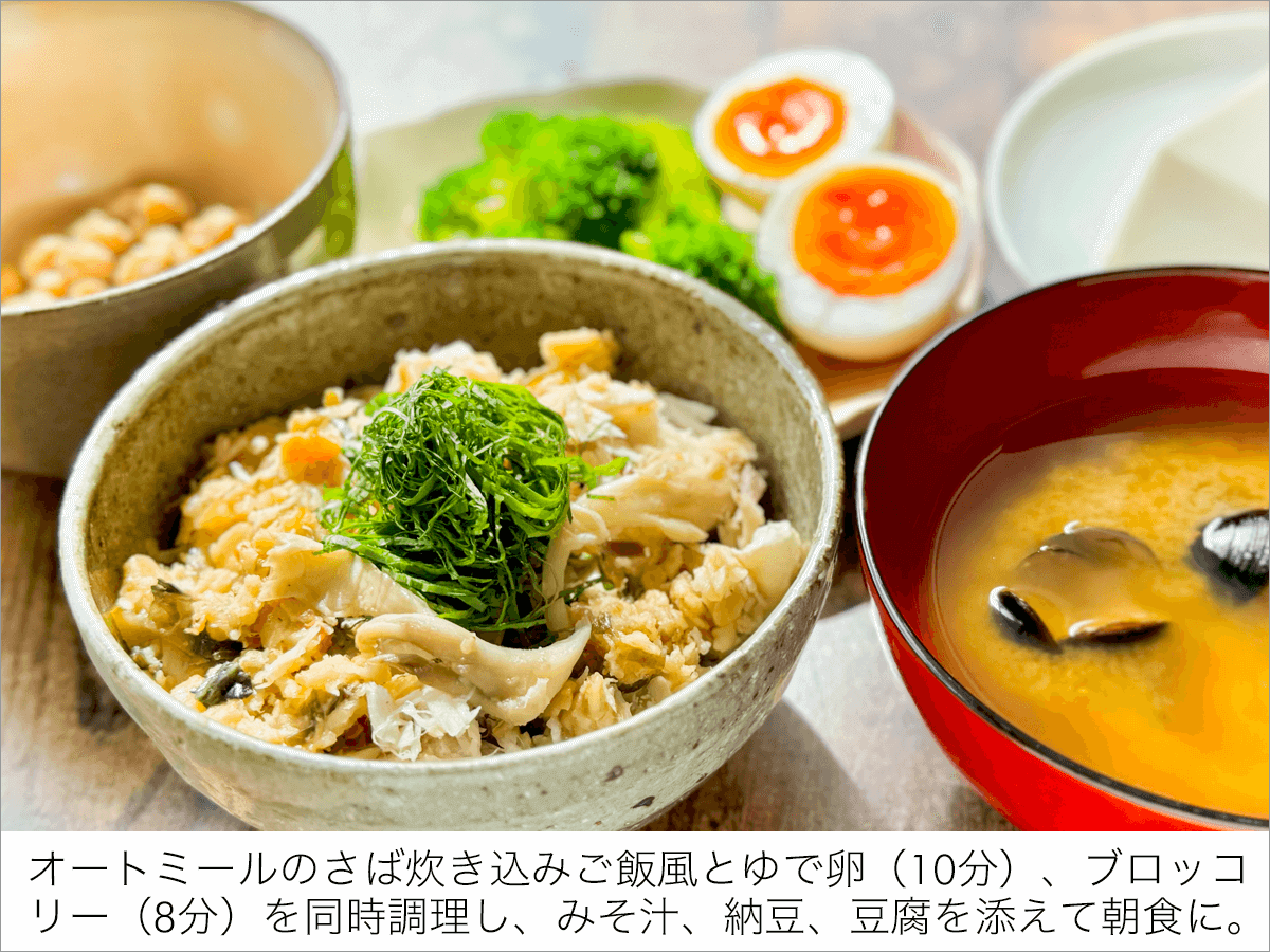 本レシピの「オートミールさば炊き込みご飯風」はこれ1膳でタンパク質20gが含まれますので、他にメインや副菜と合わせればさらにしっかり栄養が摂取できます。