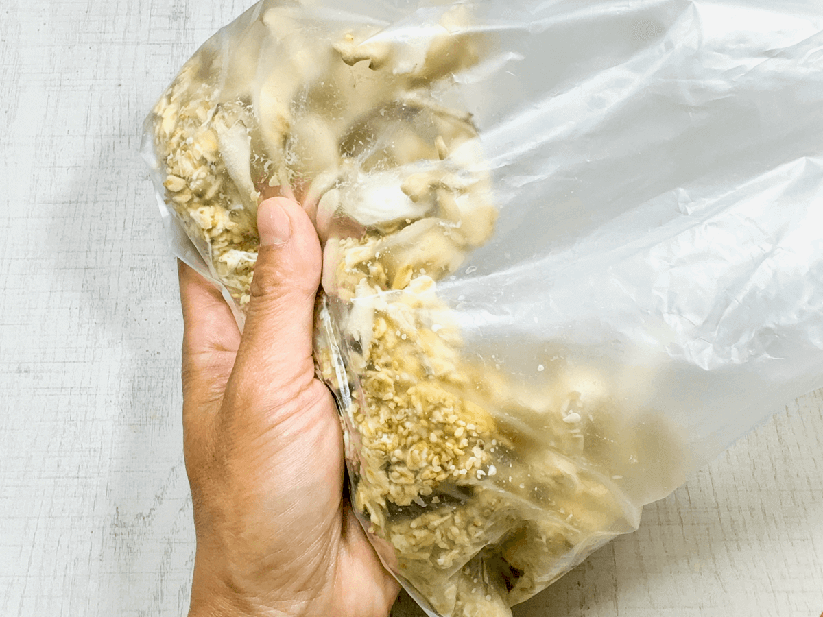 耐熱袋に<BONIQする材料>(塩さば以外)を全て入れ、袋を揉んでざっくりと混ぜ、水分を全体に行き渡らせる。