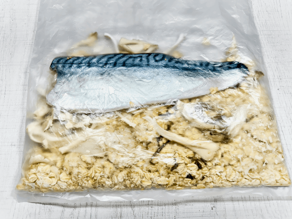 袋を平らにならして具材を広げ、塩さばを袋に加える。