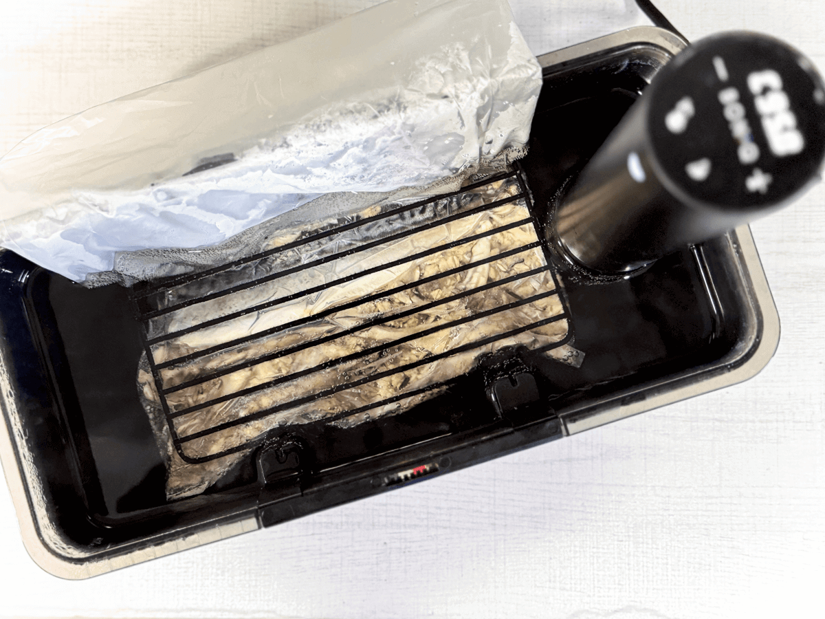 設定温度に達したら袋を湯せんに入れ、低温調理をする。
