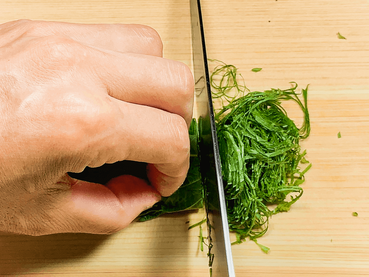 茶碗に盛り付け、大葉を添えて出来上がり。