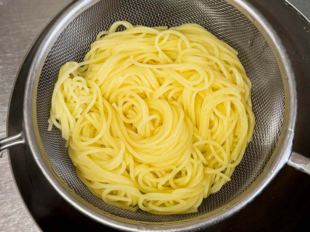 本レシピのスパゲッティは、パッケージに書かれた茹で時間「9分」のスパゲッティを使用しています。