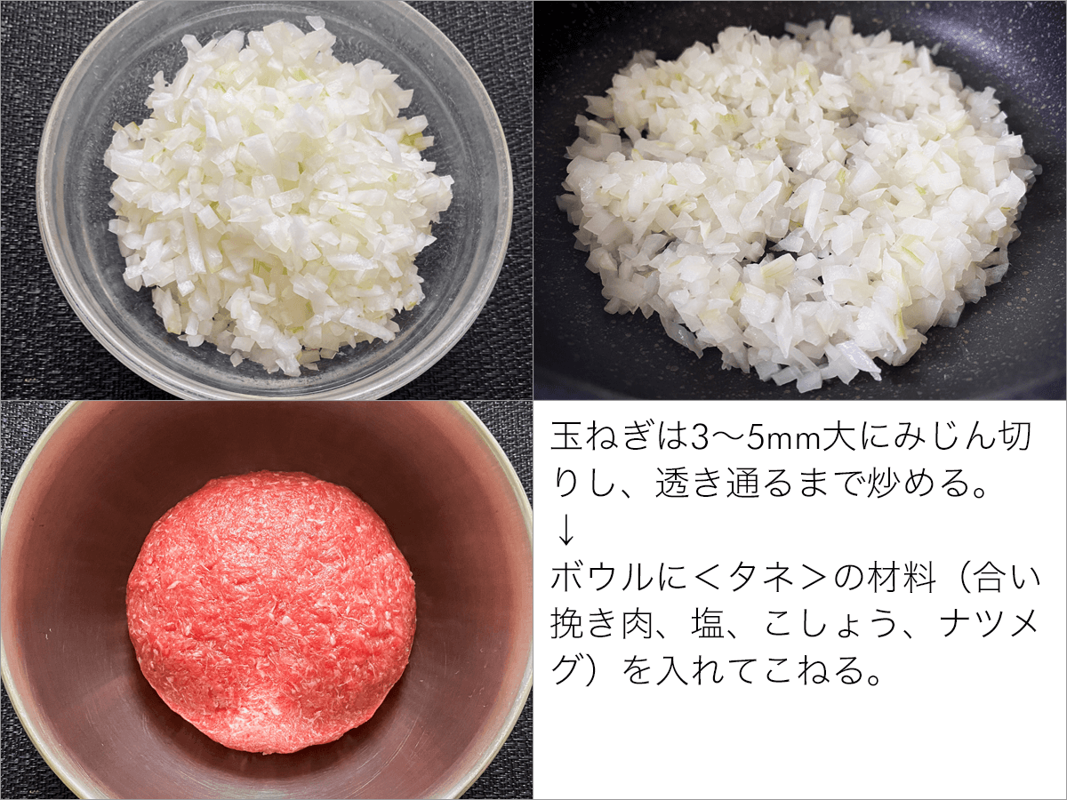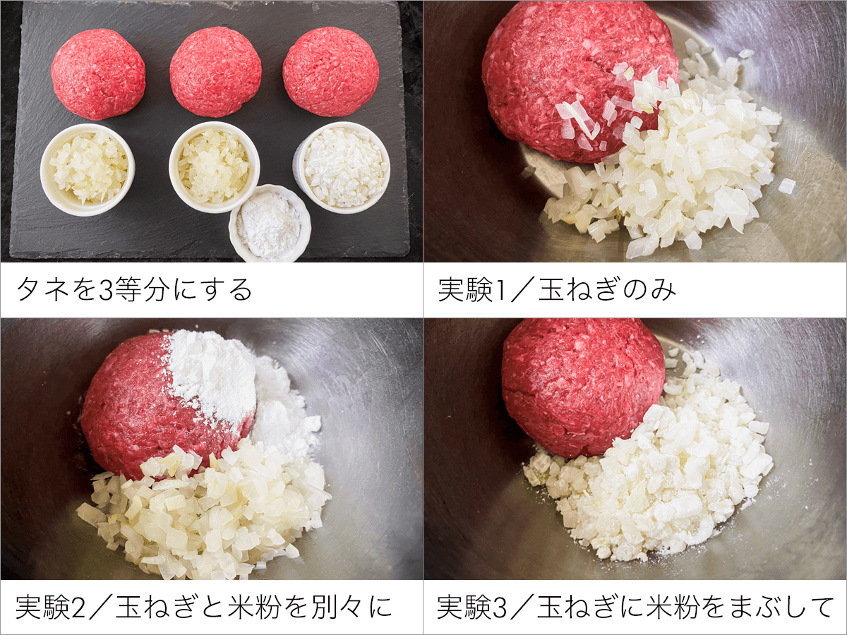 実験2は玉ねぎと米粉をそれぞれ挽き肉に混ぜ込むのに対し、実験3は炒めた玉ねぎに米粉をまぶし、パラパラの状態にしたものを挽き肉に混ぜ込む。