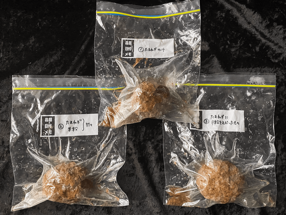つなぎを入れた、実験2(玉ねぎと米粉を別々に入れたもの)と実験3(玉ねぎに米粉をまぶして入れたもの)は仕上がりはほぼ同じとなった。