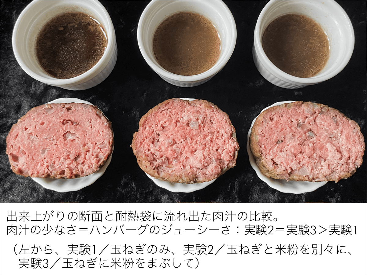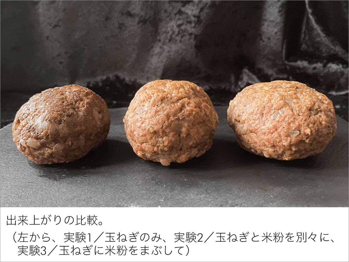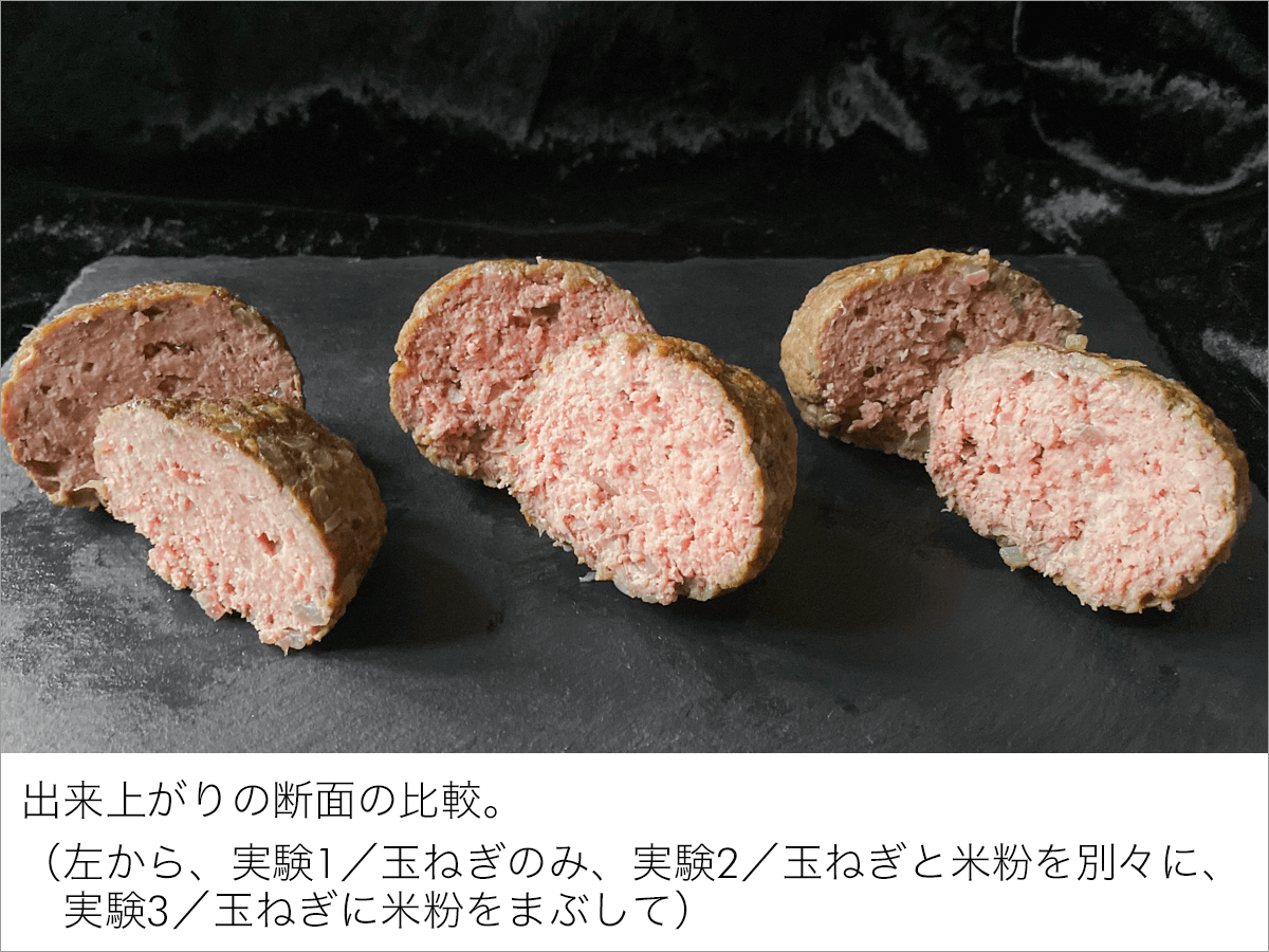 実験2は均一に米粉が混ざったのかがややわかりにくかったので、もし均一に混ぜられていなければ、一部は肉汁が流出して硬くなることも起こり得る。
