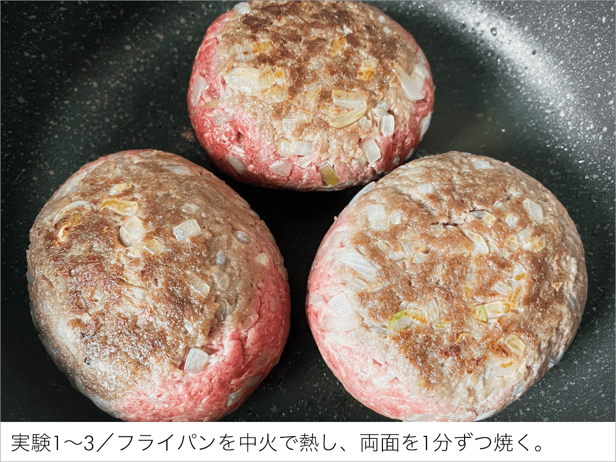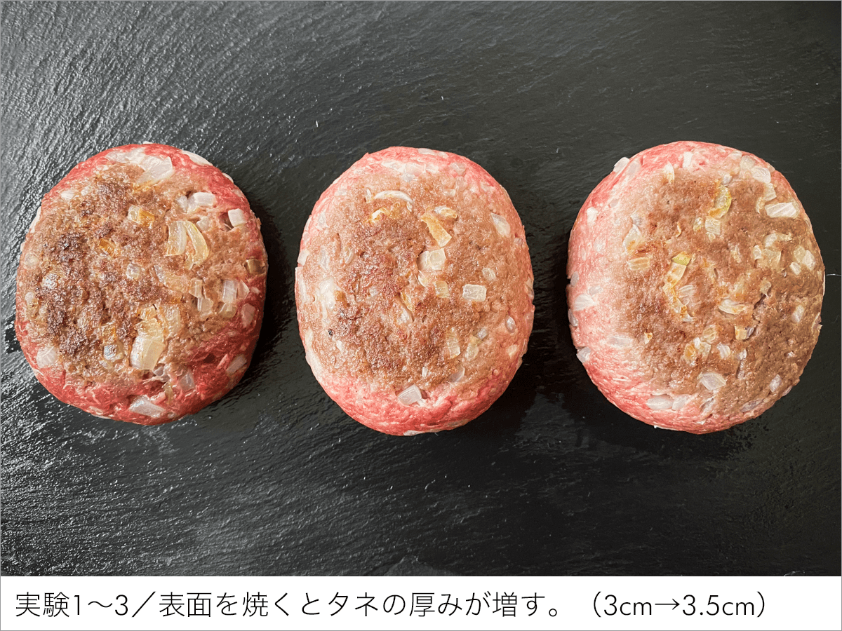 ただ、タネをこねる工程で、実験3の方がつなぎである米粉が満遍なく混ざったのがわかりやすく作りやすかった。つなぎは均等に混ざっていてこそ、どこを食べてもふっくらジューシーなハンバーグとなる。