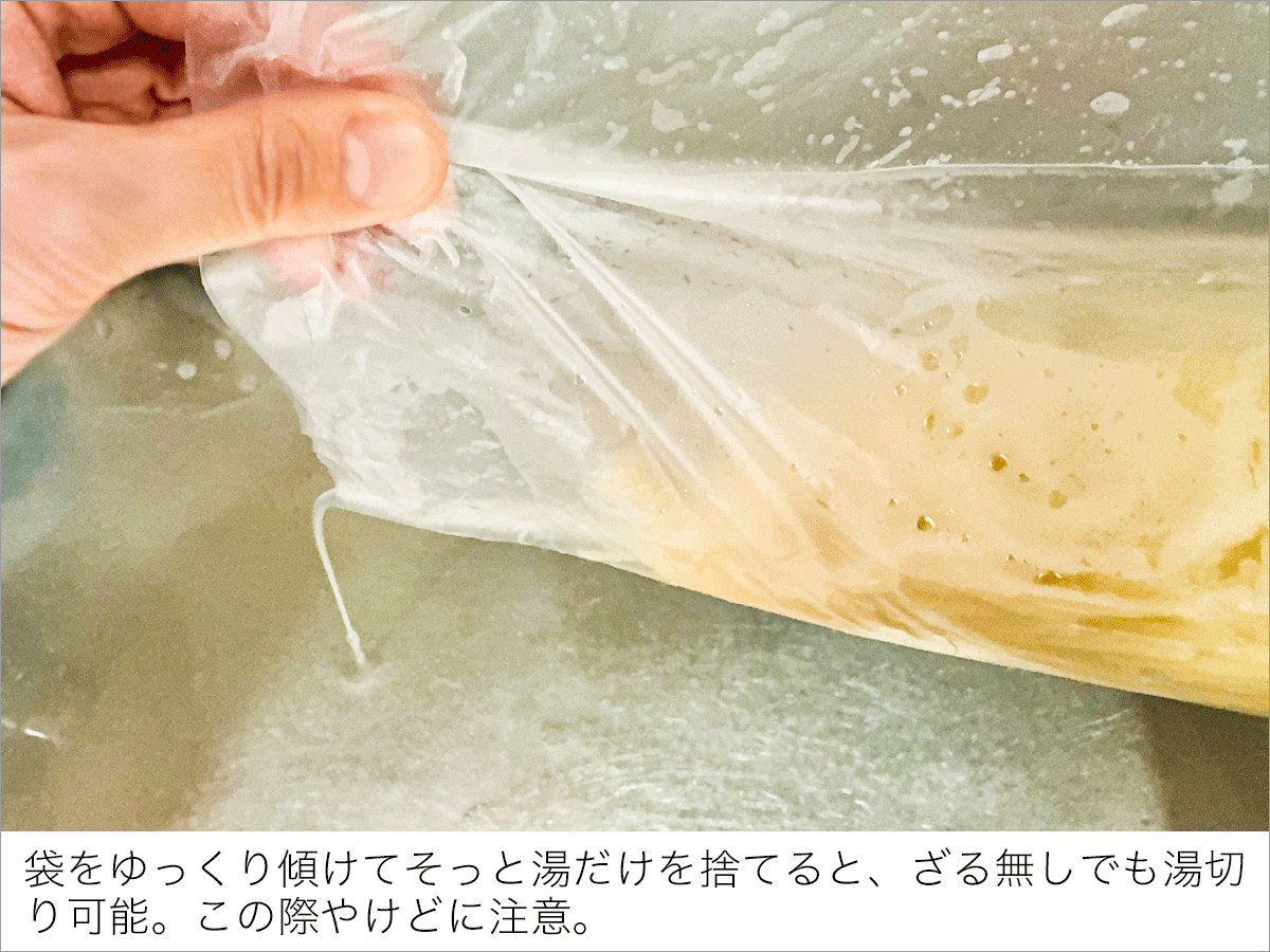 再びスパゲッティを袋に戻し、袋に<スパゲッティを冷やす氷水>(氷、水)を加える。袋を振って全体を完全に冷やし、再びざるにあけて水気をしっかり切る。